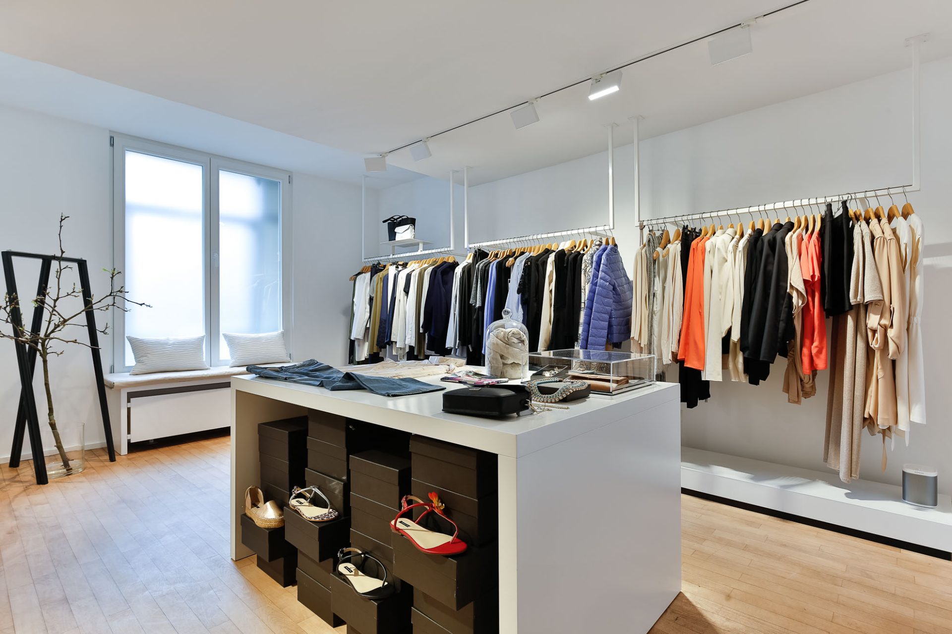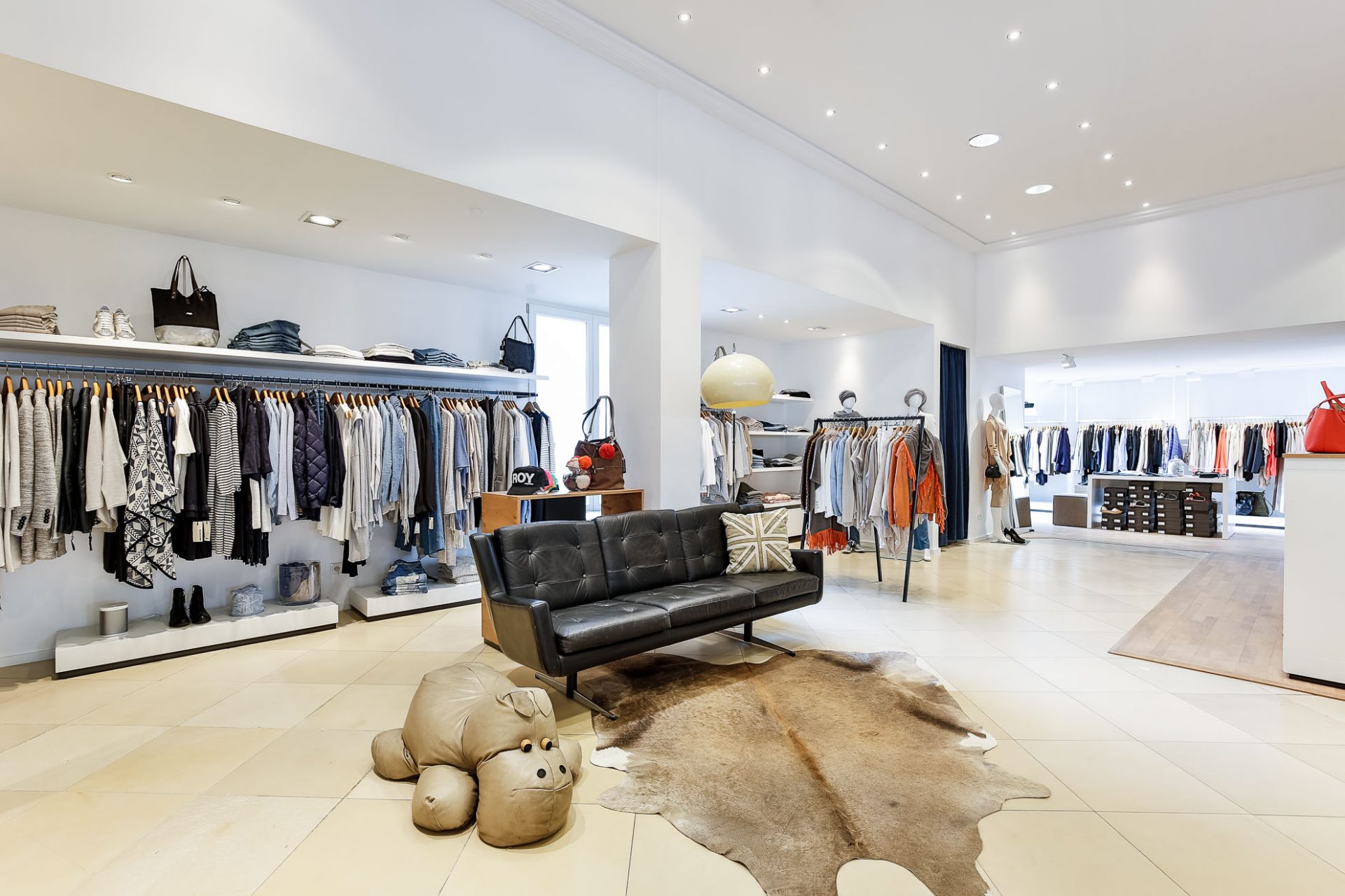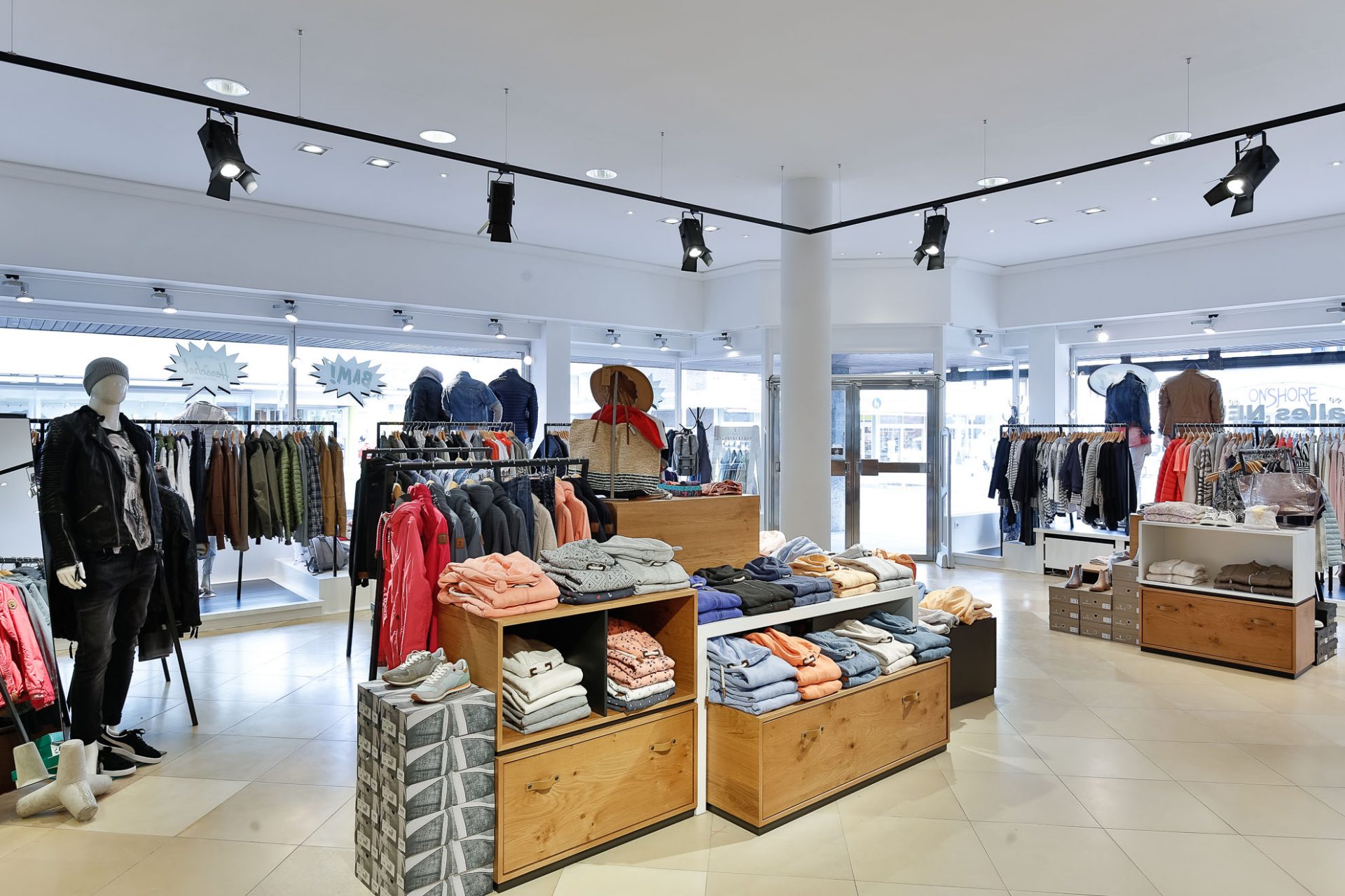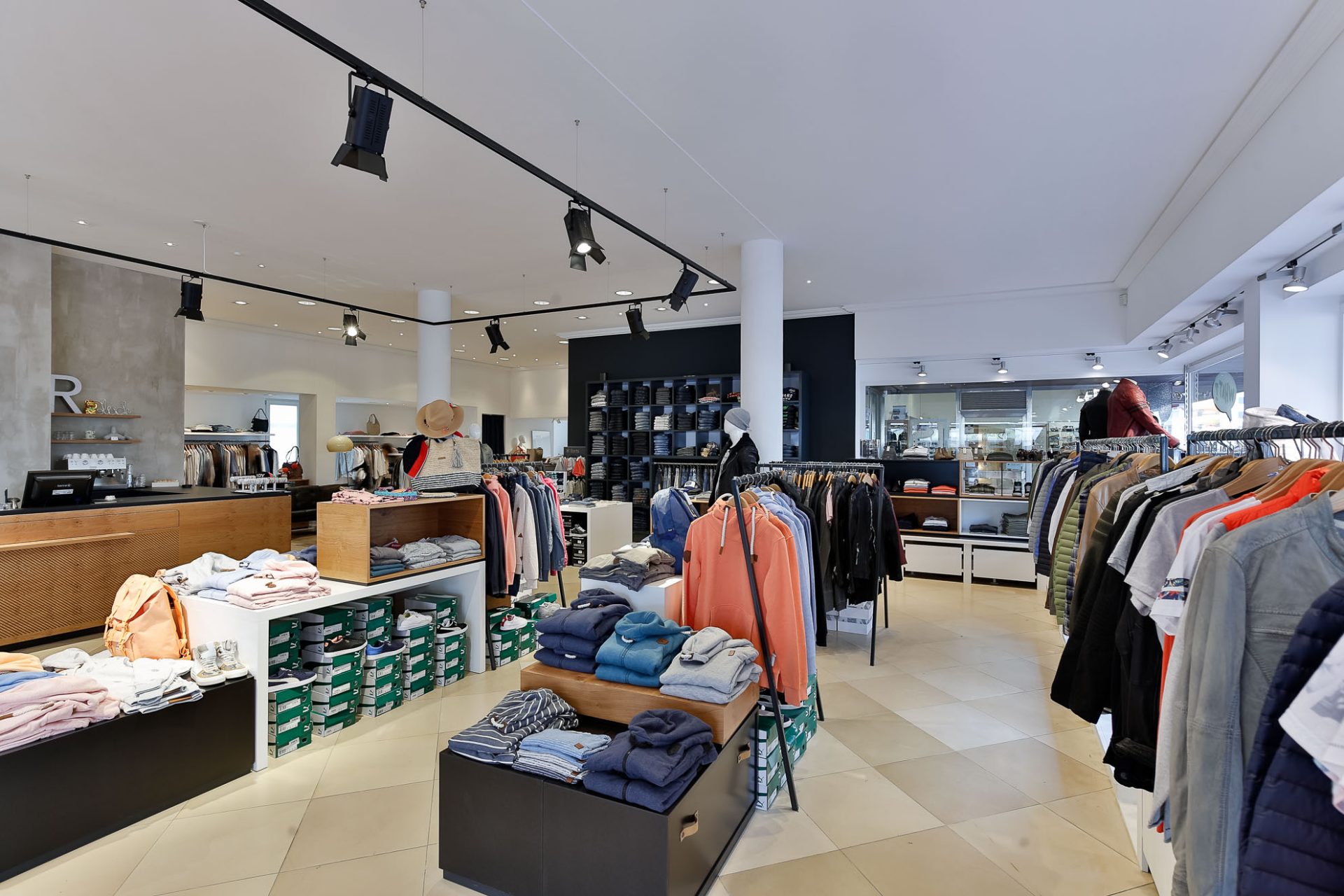 Die Decke sollte weitestgehend erhalten bleiben. Die Herausforderung war es also, die bestehenden Leuchten mit einem modernem Lichtsystem zu kombinieren. Das Thema für das neue Storekonzept war ein cooles „Bühnenfeeling“.